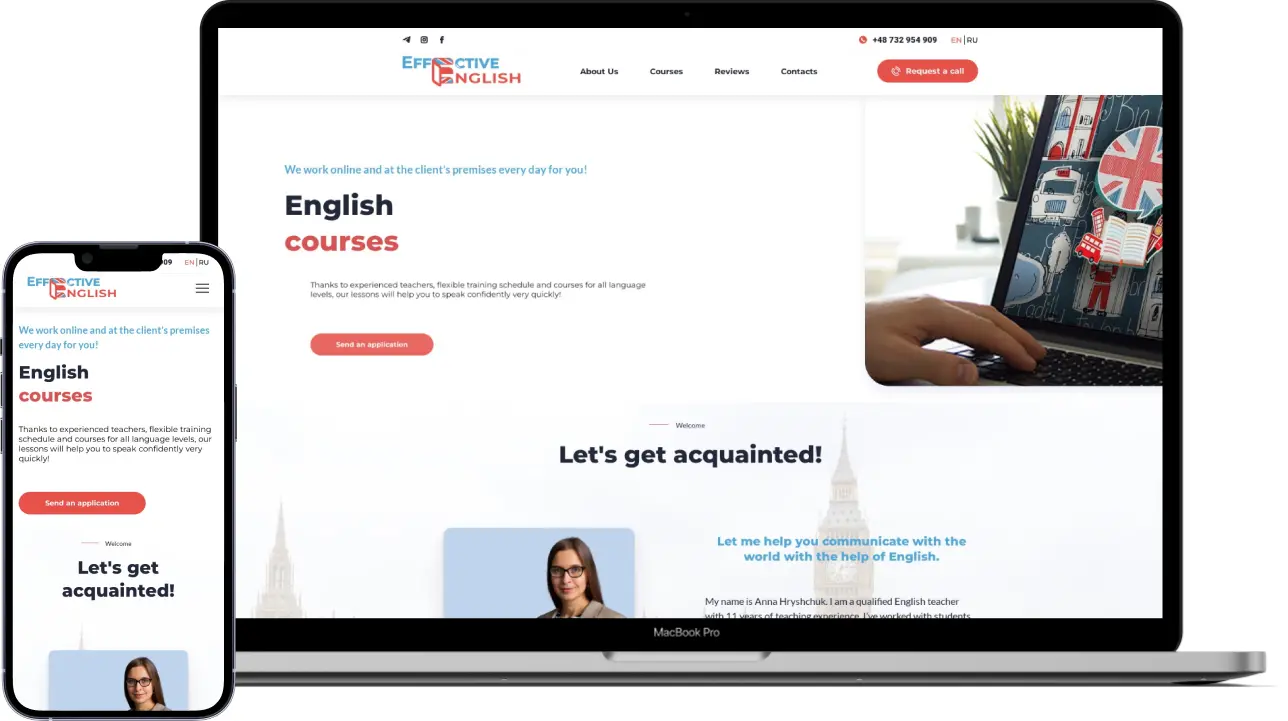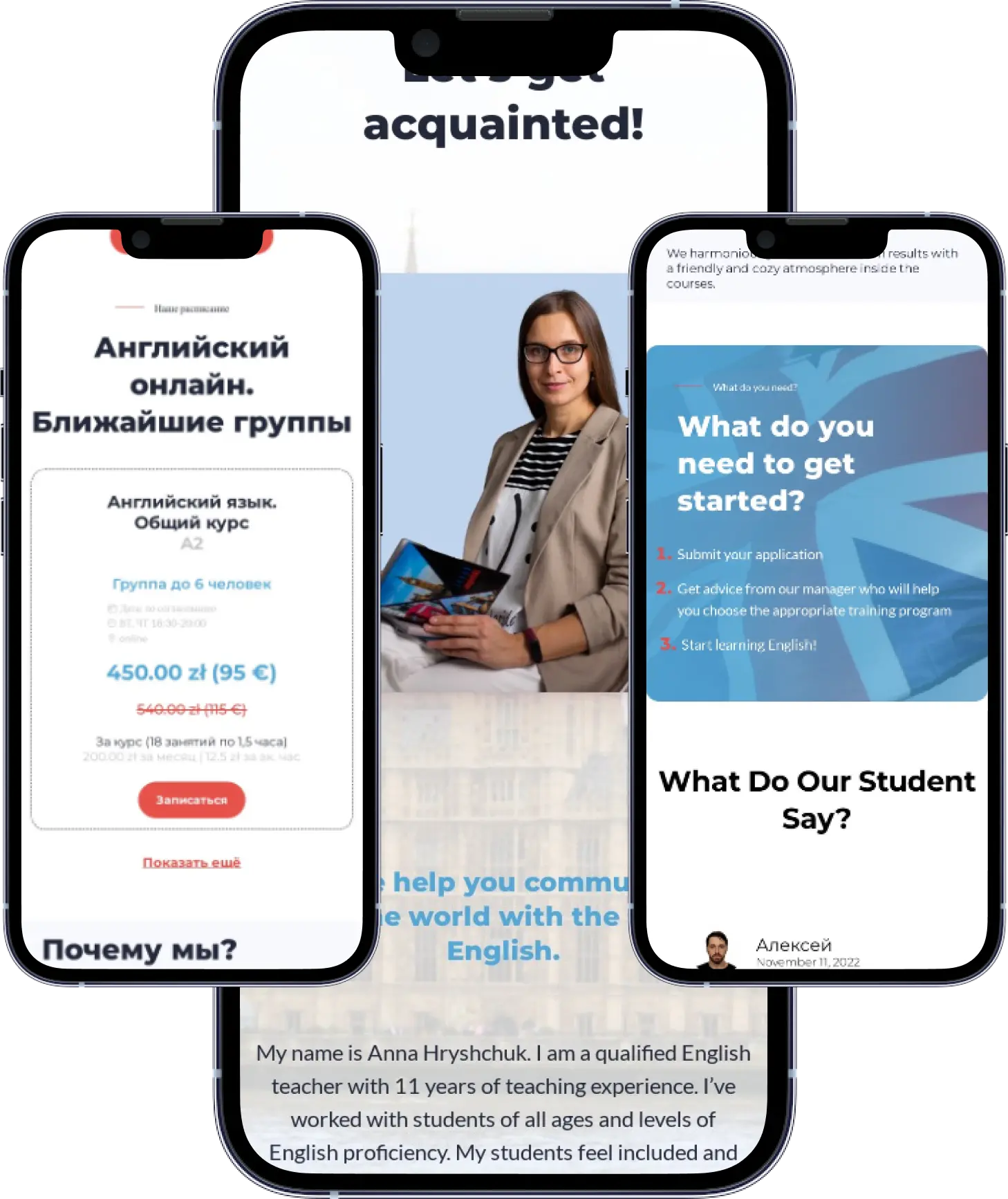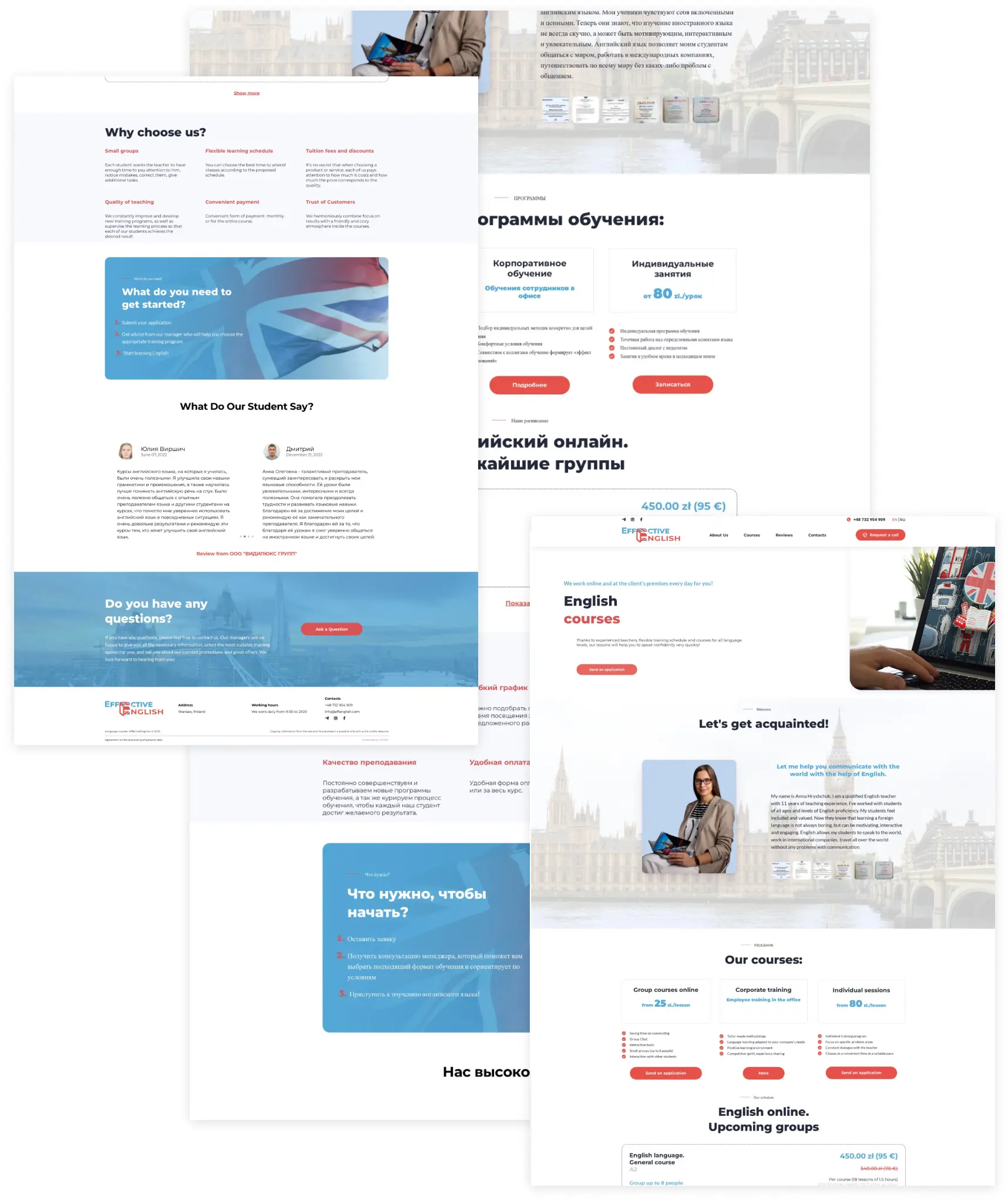 Был разработан сайт в видео лендинга для курсов английского языка в Варшаве. Сайт двуязычный, был разработан дизайн, выполненна верстка и подключение системы управления для удобного редактирования контента.