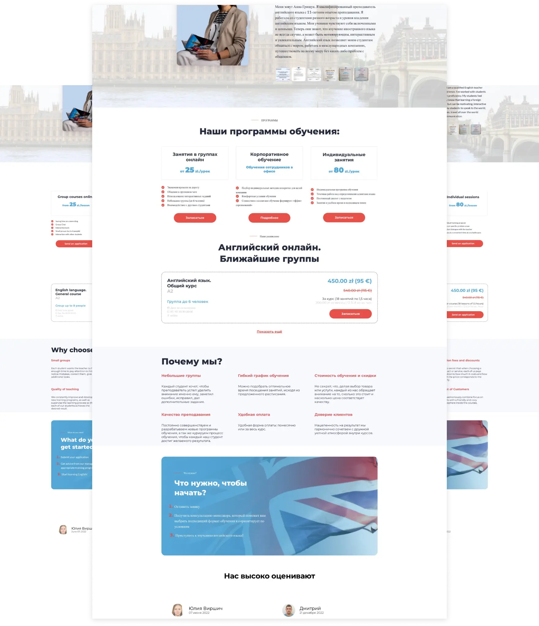 Сайт представляет из себя одностраничник (лендинг пейд) поэтому вся информация по блочно представлена на главной странице. Блок с УТП, информацией о преподавателе, тарифах, контактная информация, отзывы и т.д.